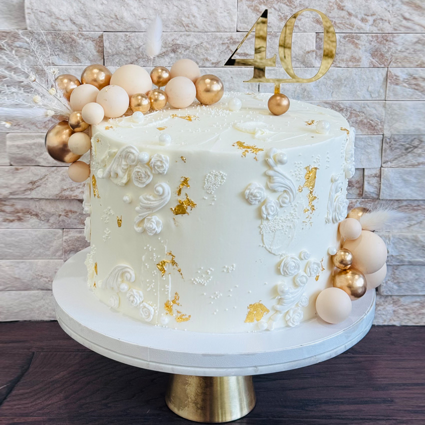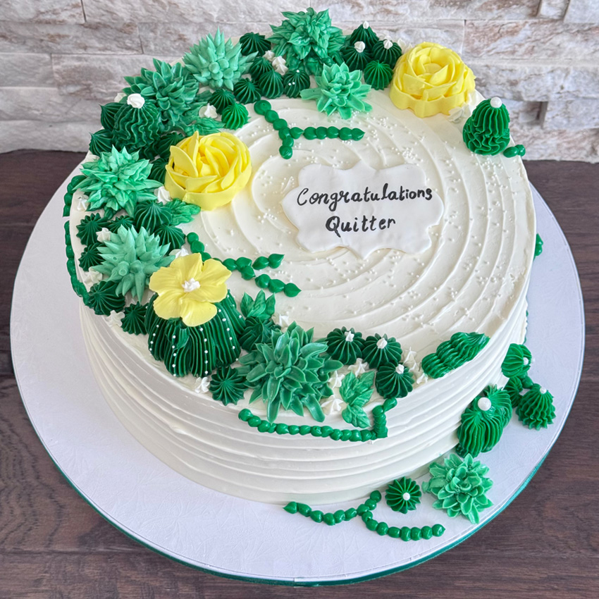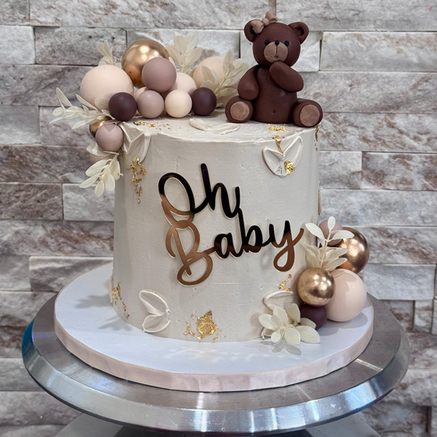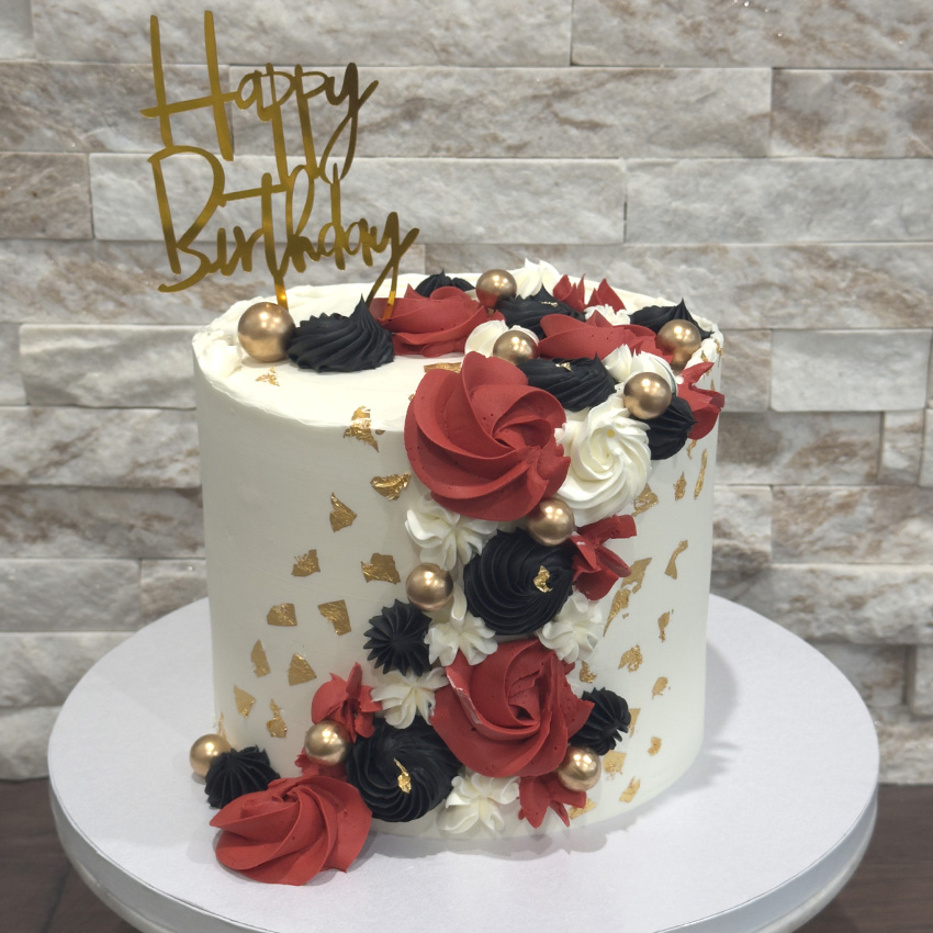 Our cakes are made with three delicious, moist layers of cake and a filling of your choice. Each cake is covered in smooth buttercream, and designs can be customized to match your theme or event.